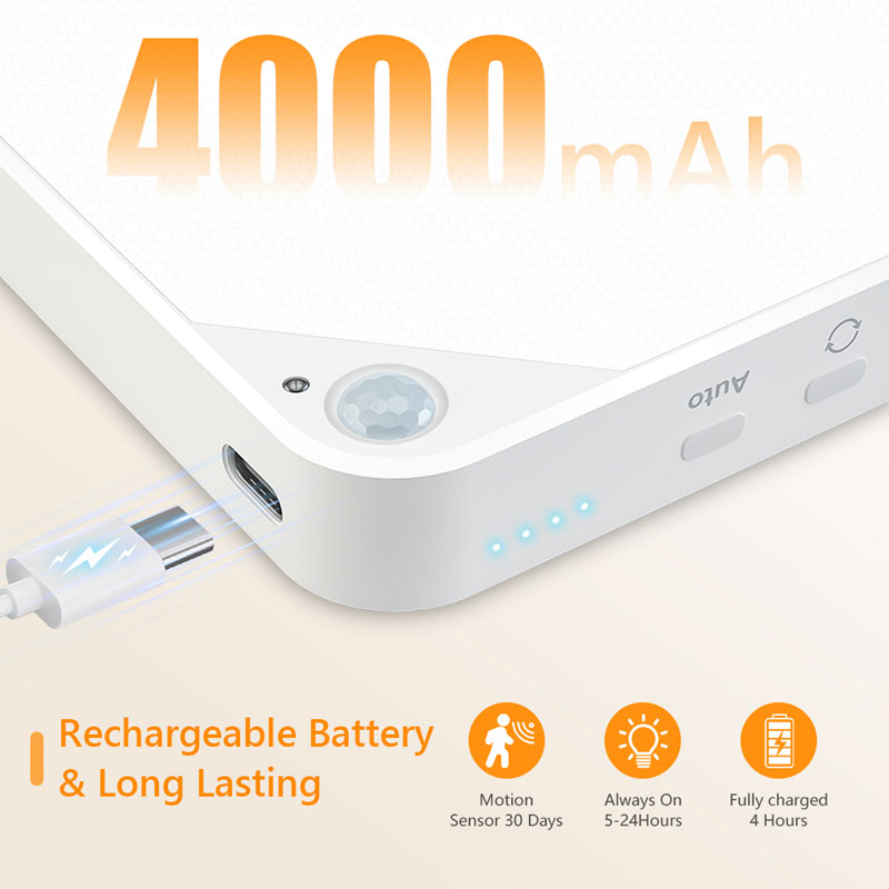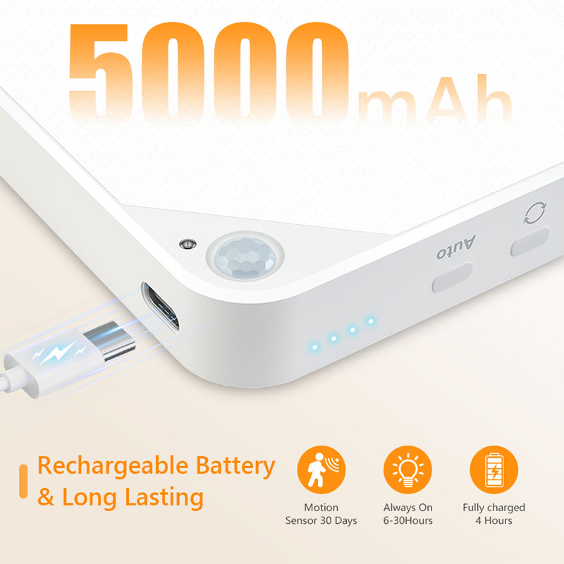 4.【Rechargeable & Long Lasting】— It’s charging by Type-C, battery powered closet lights equipped with 5000mAh rechargeable lithium battery, 4 hours to get fully charged, it can last 42 hours in lowest brightness, last 5 hours in always on mode in the brightest level.